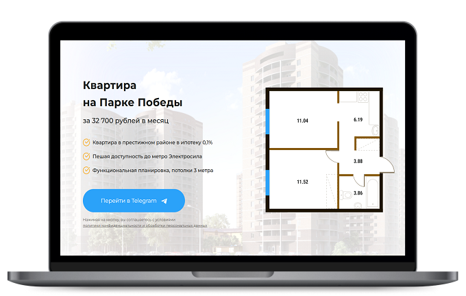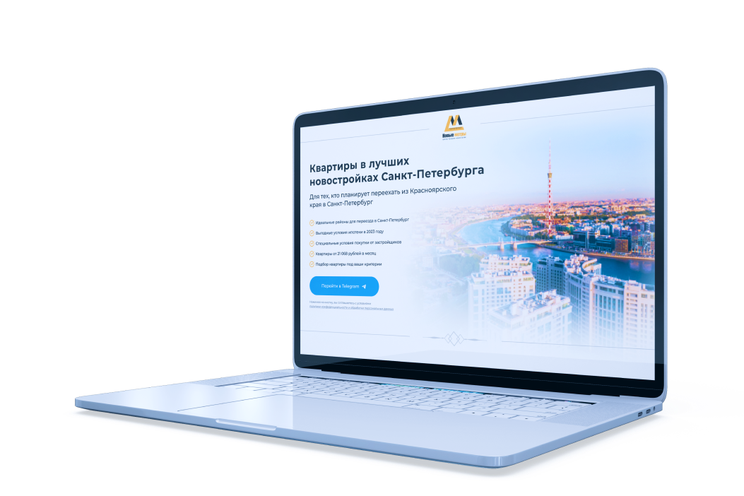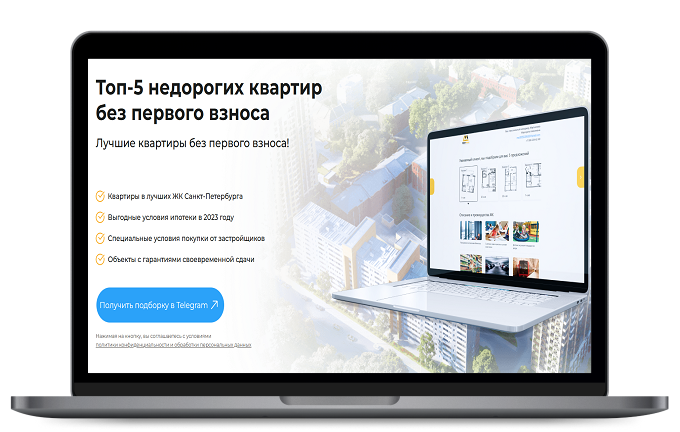Сбор теплой аудитории с помощью информативных подборок с актуальной недвижимостью. Создание нескольких посадочных страниц с подпиской на канал через чат-бот.